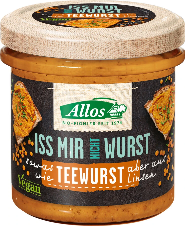 Mit Allos Iss mir nicht Wurst Teewurst erlebst du den vollen Genuss einer Streichwurst, ganz ohne tierische Produkte. Diese herzhaft deftige Delikatesse, kreiert aus nahrhaften Linsen, ist die perfekte Wahl für alle, die den Geschmack von Wurst lieben, aber eine pflanzliche Alternative bevorzugen. Ob auf dem Frühstücksbrötchen, als würziger Snack oder als kreative Komponente in deinen Gerichten – dieser Aufstrich überzeugt durch seinen authentischen Geschmack und seine Vielseitigkeit. Mach dich bereit für ein Geschmackserlebnis, das Tiere und Umwelt gleichermaßen schont.