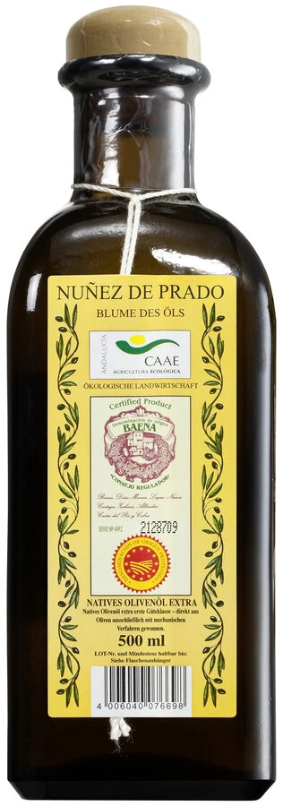 Dieses wertvolle Abtropföl wird aus Oliven gewonnen, die seit Generationen von der Familie Nunez de Prado in Andalusien angebaut, von Hand gepflückt und sorgfältig ausgewählt werden. Das Besondere an diesem Öl ist, dass die Oliven zwischen Mahlsteinen vermahlen werden und es nur durch Abtropfen ohne Pressung gewonnen wird. Die geringe Menge Öl, die hierbei entsteht, wird als ‚die Blume des Öls‘ bezeichnet. Ohne weitere Verarbeitung wird es anschließend von Hand in nummerierte Flaschen abgefüllt. Auf traditionelle Weise hergestellt, ist ‚die Blume des Öls‘ eine Kostbarkeit und betört durch ihr volles Aroma und den Duft nach Früchten.