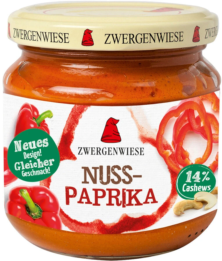 Gib deinem Frühstück oder Snack einen Kick mit dem Zwergenwiese Nuss-Paprika Aufstrich. Diese einzigartige Mischung aus saftiger Paprika und knackigen Cashews, alles in Bio-Qualität, glutenfrei und vegan, ist nicht nur pur ein Genuss, sondern auch ideal zum Kochen und Verfeinern deiner Lieblingsgerichte. Ein Muss für Feinschmecker, die auf der Suche nach einem geschmackvollen Highlight sind.