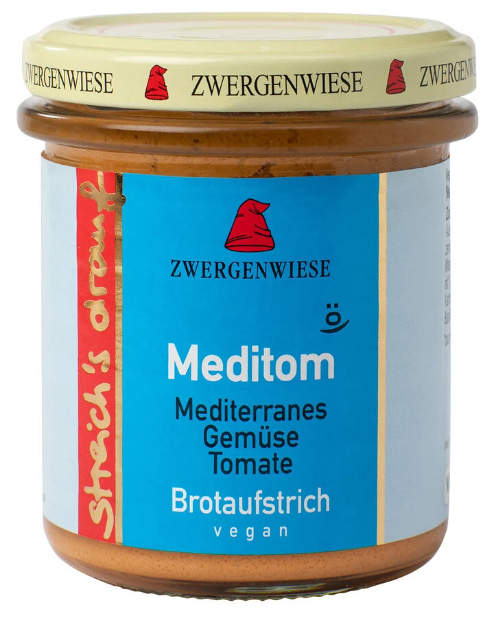 Tauche ein in die Geschmackswelt des Mittelmeers mit dem Zwergenwiese streichs drauf Meditom. Dieser besonders cremige, vegane Brotaufstrich vereint die Frische mediterranen Gemüses mit der sonnigen Note von Tomaten. Ideal für kreative Sandwiches, als raffinierter Dip oder zum Verfeinern deiner Lieblingsgerichte. Hergestellt aus hochwertigem Bio-Rapsöl und deutschen Bio-Sonnenblumenkernen, bringt dieser Aufstrich Vielfalt und Genuss auf deinen Tisch – und das alles in Bio-Qualität.