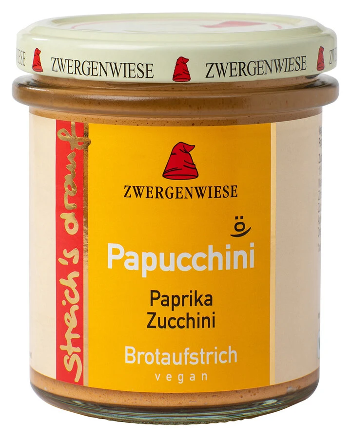 Gönn dir eine Geschmacksexplosion mit Zwergenwiese streichs drauf Papucchini. Dieser vegane Bio-Brotaufstrich kombiniert die Cremigkeit von Bio-Rapsöl und deutschen Bio-Sonnenblumenkernen mit dem frischen Geschmack von Paprika und Zucchini. Perfekt für außergewöhnliche Sandwiches, als Dip, Dressing oder zum Verfeinern deiner Gerichte. Ein vielseitiger Genuss, der jede Mahlzeit in ein kulinarisches Erlebnis verwandelt.